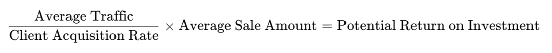 Using a mathematical equation for average traffic divided by client acquisition rate and average sale amount we will show you your potential ROI based upon the mentioned timelines below.